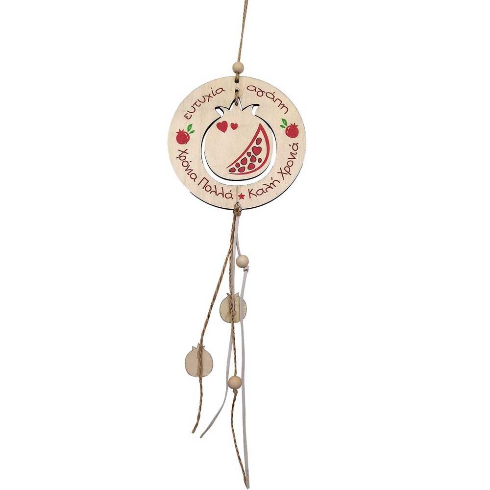 Κρεμαστό γούρι ξύλινο σε σχήμα ρόδι, της εταιρίας XMASfest, για να διακοσμήσετε τον χώρο σας και να του δώσετε μια πιο γιορτινή νότα.