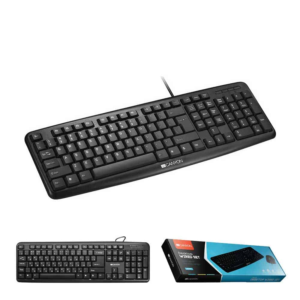 Ενσύρματο πληκτρολόγιο της εταιρείας Canyon με καλώδιο USB για σύνδεση σε κάθε συσκευή που διαθέτει τέτοια θύρα.