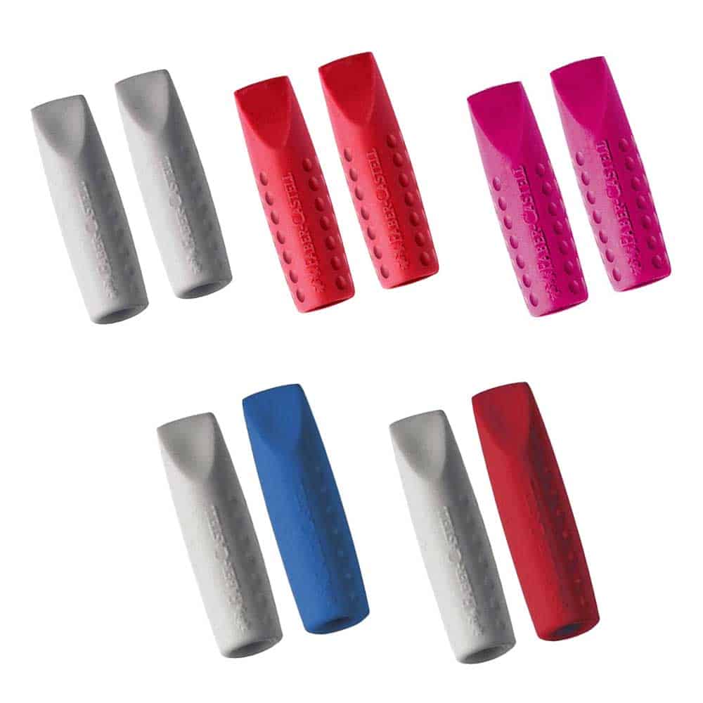 Η γόμα GRIP Eraser Cap -προσαρμοσμένη στην κάτω άκρη για να δώσει μήκος στο μολύβι ή μπροστά για να προστατεύει τη μύτη, είναι πάντα δίπλα σας όταν την χρειάζεστε. Διαθέτει την ίδια υψηλή ποιότητα με όλες τις γόμες Faber-Castell και φυσικά δεν περιέχει PVC. Διατίθεται σε τρία χρώματα (γκρι, φούξια και μπλε). Μπορεί να τοποθετηθεί στο κάτω μέρος για να επιμηκύνει το μολύβι ή στο μπροστινό για να προστατεύσει τη μύτη. Διάφορα χρώματα γόμες-καπάκια σε σακουλάκι.
