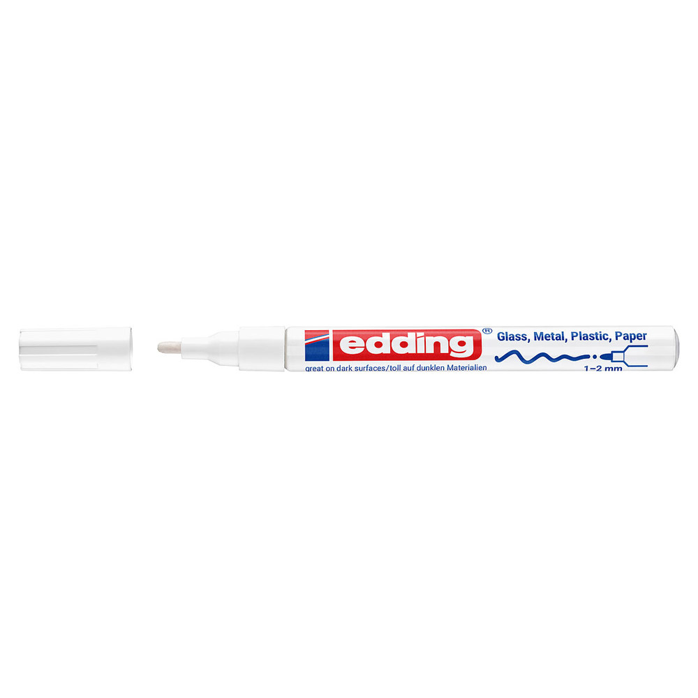 Επαγγελματικός μαρκαδόρος λαδιού Edding 751 σε λευκό χρώμα με λεπτή μύτη 1-2mm. Ιδανικός για μόνιμη, αδιαφανή γραφή σε σκούρες επιφάνειες, μέταλλο, γυαλί και πλαστικό.