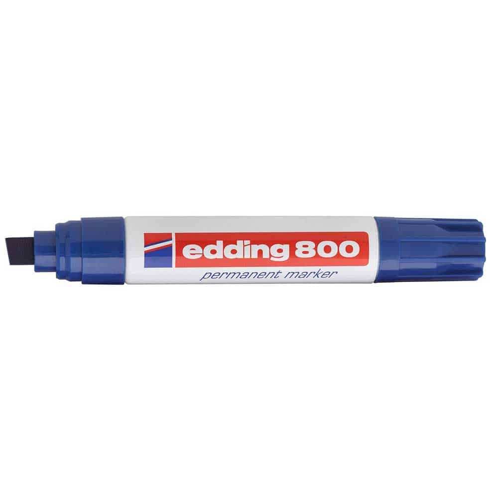 Επαγγελματικός ανεξίτηλος μαρκαδόρος Edding 800 σε μπλε χρώμα, με πλακέ μύτη μεγάλου πάχους (4-12mm). Ιδανικός για μόνιμη γραφή σε σχεδόν όλες τις επιφάνειες, με μελάνι που στεγνώνει γρήγορα και είναι ανθεκτικό στο φως και το νερό.