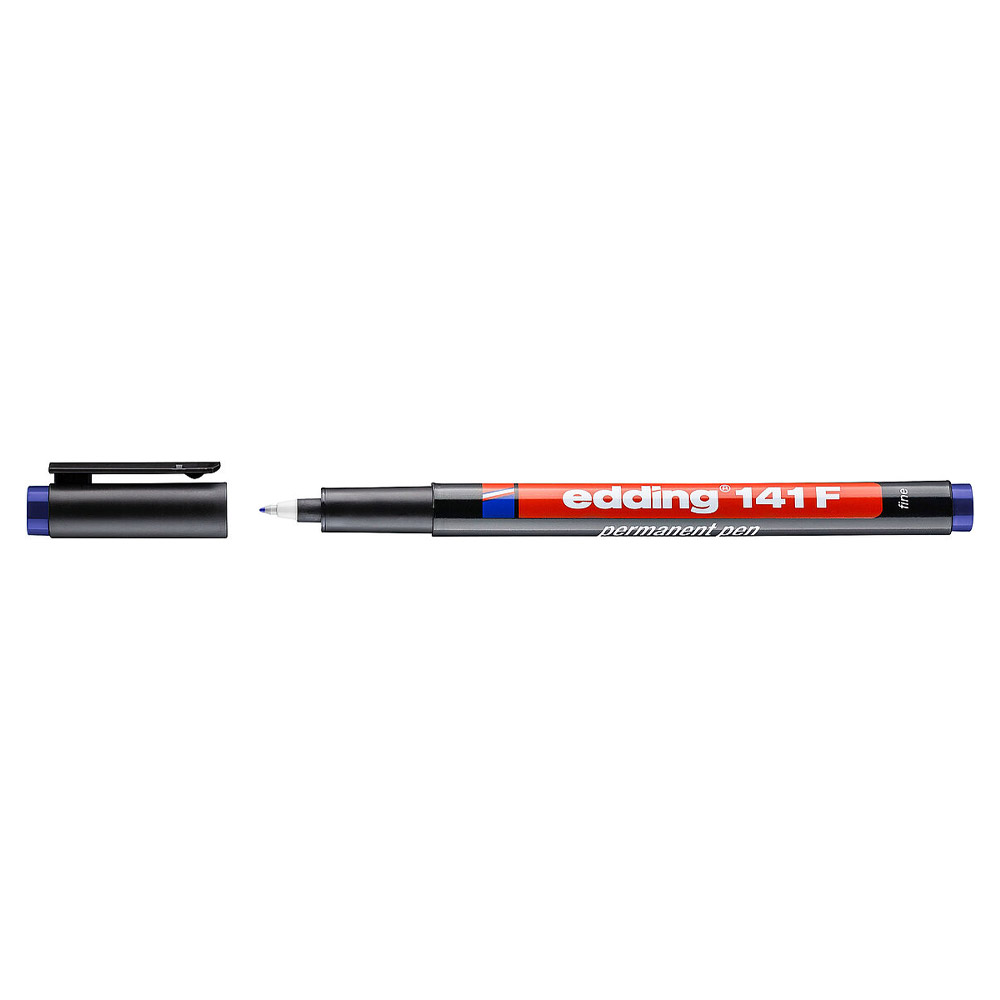 Ανεξίτηλος μαρκαδόρος Edding 141 F σε μπλε χρώμα με λεπτή μύτη 0.6mm. Ιδανικός για μόνιμη γραφή σε λείες επιφάνειες, πλαστικό, γυαλί και διαφάνειες, με μελάνι που στεγνώνει άμεσα.