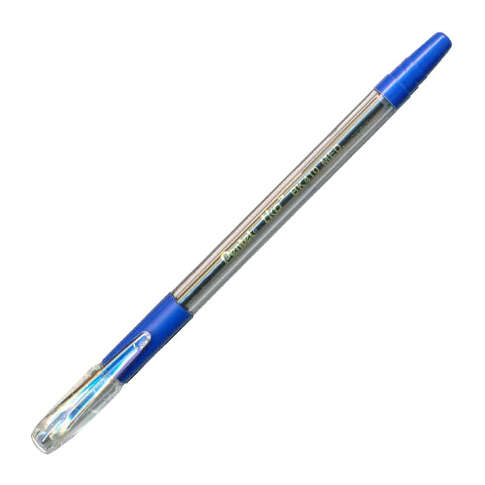 Στυλό Pentel τύπου ballpoint, με μπλε μελάνι και μύτη πάχους 1.0mm. Τα ballpoint στεγνώνουν γρήγορα και δεν αφήνουν μουτζούρες. Το μελάνι διαρκεί περισσότερο σε σχέση με τους άλλους τύπους, αλλά η γραφή είναι λιγότερο ομαλή και μπορεί να αφήσει κενά. Κατάλληλοι για όλες τις ποιότητες χαρτιού και για καθημερινή χρήση.