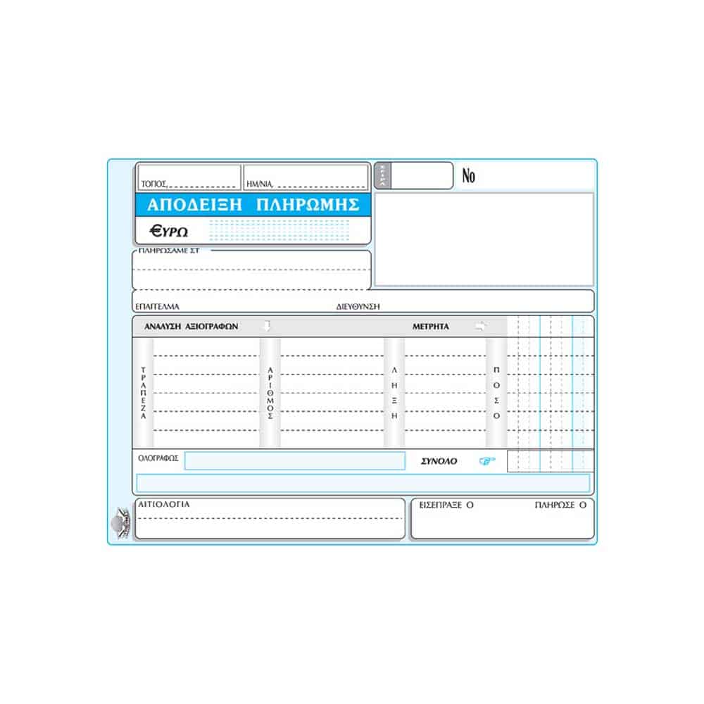 Απόδειξη Πληρωμής Μπλοκ με ανάλυση για την είσπραξη μετρητών & αξιογράφων με ύψος 13cm και πλάτος 18cm.