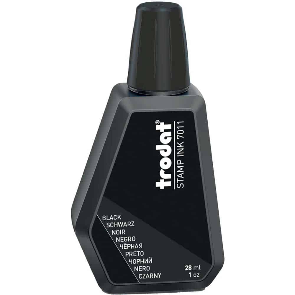 Trodat 7011 Μελάνι Σφραγίδας Μαύρο σε μπουκαλάκι 28ml με στόμιο ελεγχόμενης ροής, για οποιοδήποτε ταμπόν σφραγίδων Trodat. Ελέγξτε για την καλή κατάσταση του ταμπόν σας και το μελάνι της Trodat θα αναζωογονήσει το χρώμα αποτύπωσης της σφραγίδας σας. Η προτεινόμενη ποσότητα εφαρμογής είναι μια σταγόνα μελανιού ανά τετραγωνικό πόντο του ταμπόν σας. Ειδικό για σφράγισμα σε χαρτί. Στεγνώνει ταυτόχρονα με το σφράγισμα και έχει τέλειο αποτέλεσμα. Δεν ενδείκνυται για χρήση σε γυαλιστερό χαρτί, πλαστικά, γυαλί και μέταλλα.